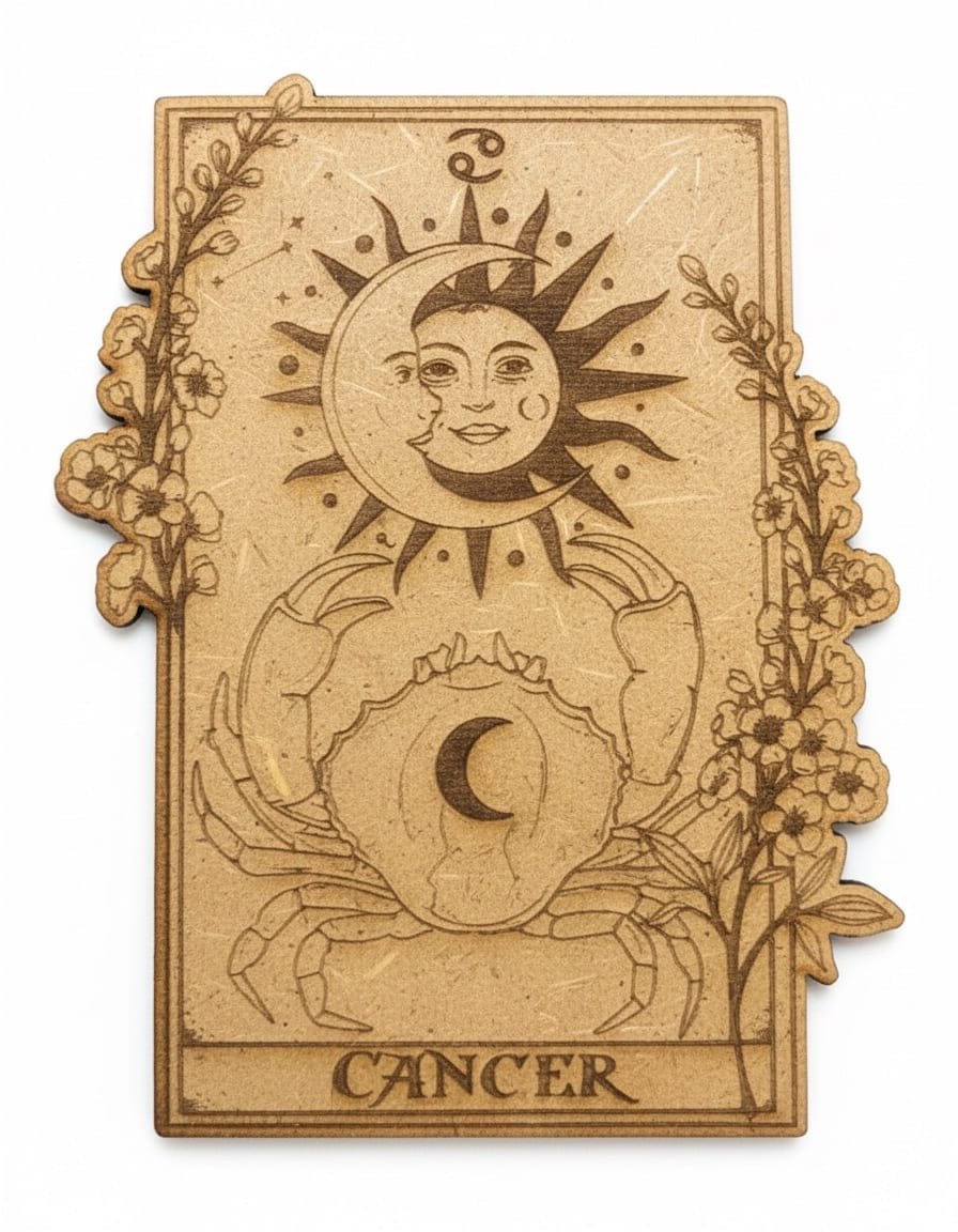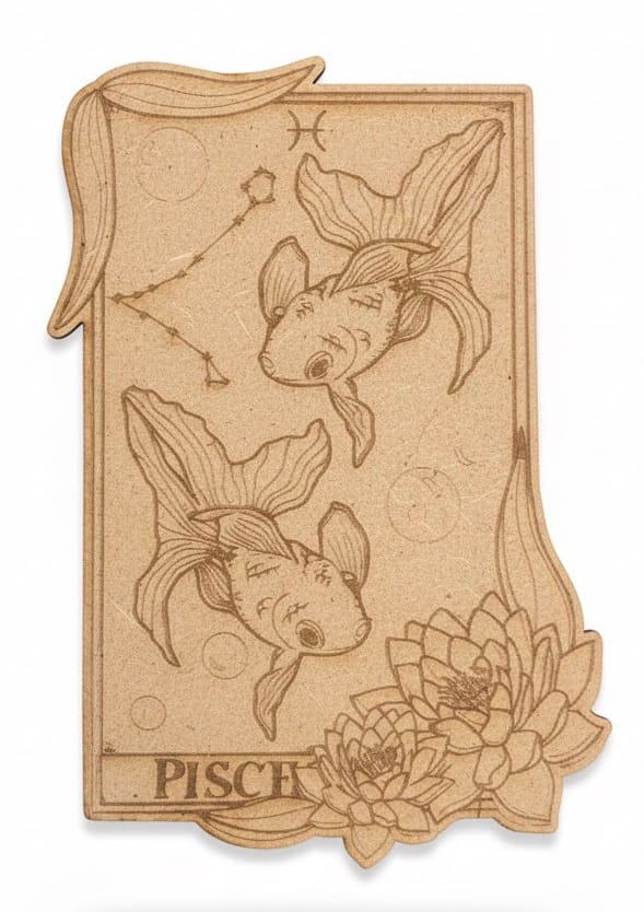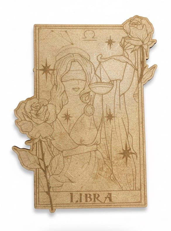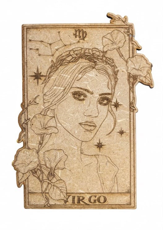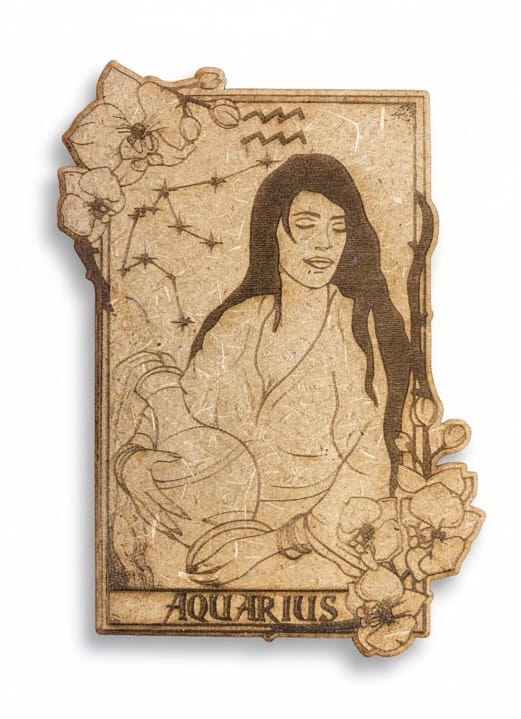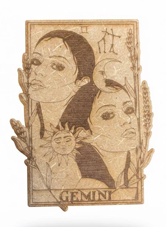 Colección de cartas de horóscopo en madera, grabadas con un estilo rústico y detallado que representa a cada signo del zodiaco. En el reverso de cada pieza, encontrarás una descripción breve de las características del signo. Son ideales para decorar o como un regalo original y significativo.